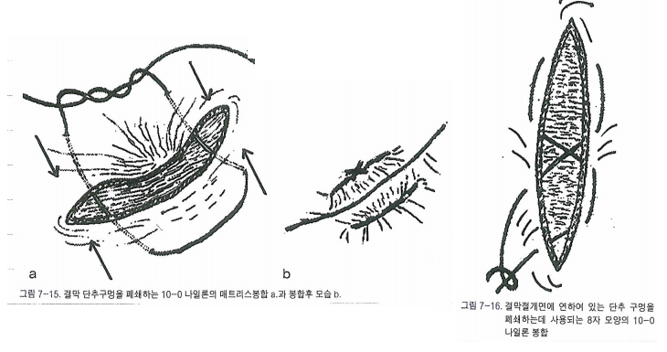 매트리스 봉합이나, 8자 모양 봉합으로 단추구멍을 폐쇄시킵니다.