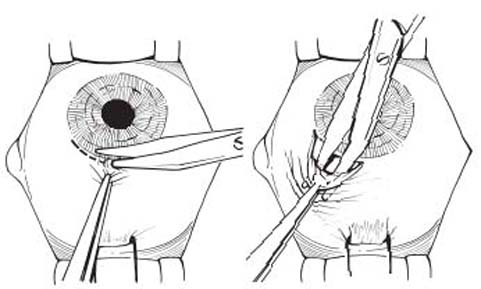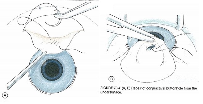 결막에 발생한 단추구멍이 윤부에서 떨어져 있고, 결막편의 한가운데 있는 경우에는 조직의 안쪽면에서 단추구멍을 꼬매어 폐쇄시키는 방식으로 치료하게되고,