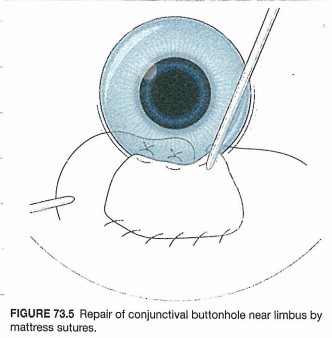 단추구멍이 윤부가까이에 있는 경우에는, 결막 윤부주위에서 매트리스 봉합(mattress suture)을 통해서 치료해줍니다.