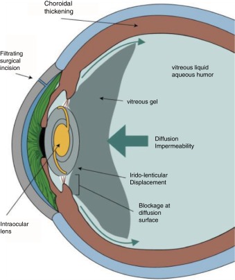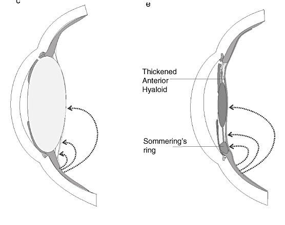 유리체강내에 방수가 점점 축적되면서, 후방양압(Posterior Positve Pressure)에 의해
